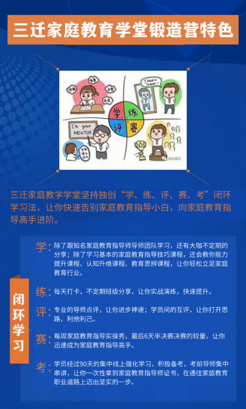 三迁家庭教育学堂坚持独创“学、练、评、赛、考”闭环学习法,让你快速告别家庭教育指导小白,向家庭教育指导高手进阶。