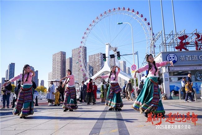 天津之眼、古文化街、鼓楼等标志性景区,因“藏东行·遇见红色昌都”文旅快闪活动而增添别样风情。在天津之眼,演职人员身着盛装进行巡游互动、即兴表演,康巴舞的激情四溢、藏东民歌的悠扬婉转,吸引众多游客驻足观赏、互动合影。在古文化街和鼓楼,快闪活动与古色古香的建筑、传统民俗完美交融,工作人员向游客发放宣传资料、邀请打卡拍照,有效提升了“红色昌都·藏东明珠”品牌的曝光度和好感度,引发了游客对昌都的强烈好奇与向往。